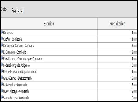 La información de las lluvias fue publicada por la Dirección de Hidráulica de Entre Ríos, y corresponden a registros tomados en dependencias policiales del territorio departamental.