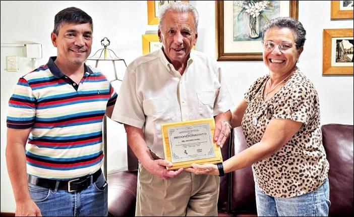 “Visitando al Dr. Arturo Vera para hacerle entrega de la placa en reconocimiento como Presidente de la Comisión del Festival en dos períodos. ¡Aprovechamos para hablar un poco y ponernos al día!”, escribió Alicia Oviedo, quien acudió al encuentro acompañada del Secretario Municipal de Gobierno y Hacienda, Carlos Ayala.