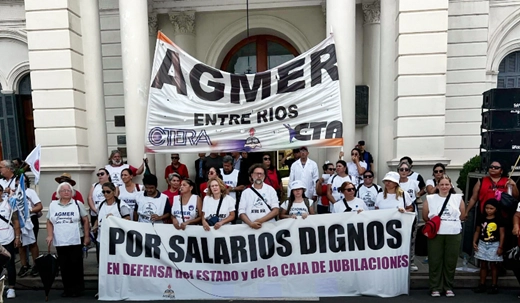 La docencia entrerriana se movilizó este lunes en la capital provincial en el marco del paro nacional de CTERA, en reclamo de convocatoria a paritaria nacional, con fuertes críticas del secretario general del sindicato, Marcelo Pagani, que sugirió que el gobernador, Rogelio Frigerio, “salió a cuidarlo a Milei”.