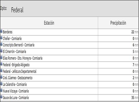 Según lo publicado por la Dirección Provincial de Hidráulica, con datos suministrados por la Policía Departamental de Federal, los siguientes fueron los registros de lluvias tomados en las diferentes dependencias de la fuerza: