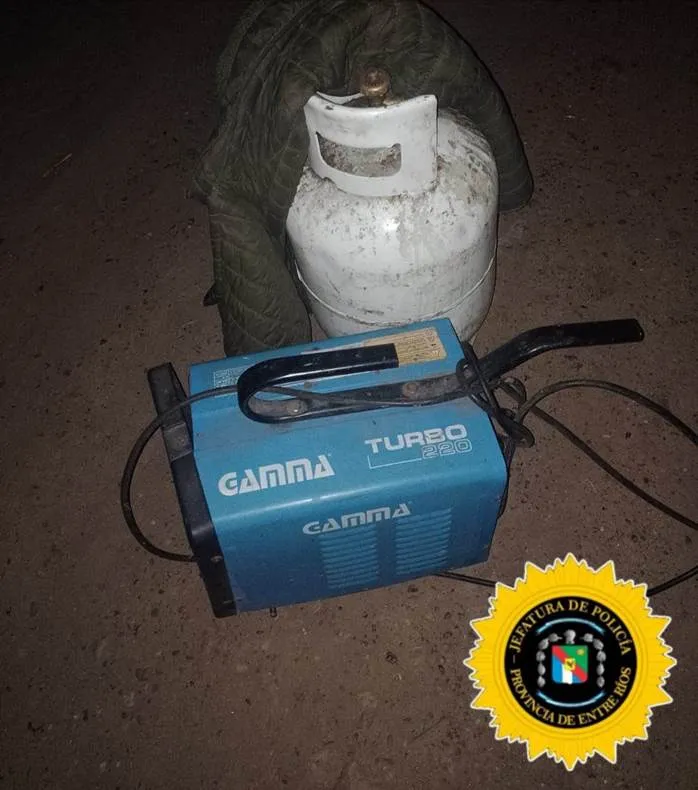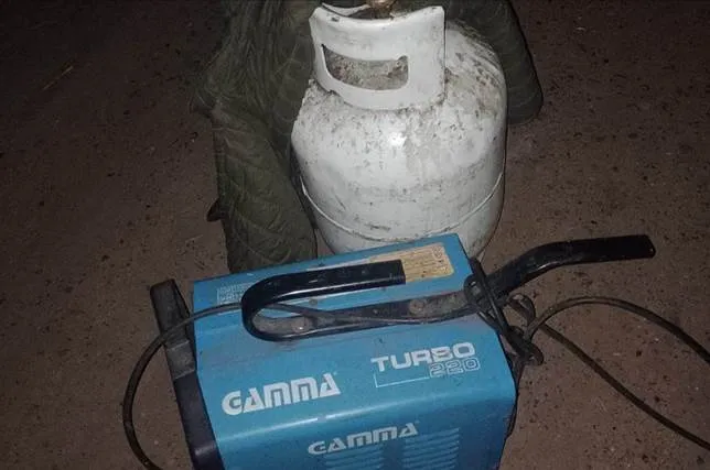 SECC. CDO. RADIOELECTRICO: INFORME: siendo las 02:00 horas de este jueves, en calle Echagüe y Sarmiento, un movil del comando observo a dos masculinos que al percatarse del personal salieron corriendo, descartándose de los siguientes elementos: 1 campera de nailon color verde oscuro, 1 garrafa de 10 kg de color blanca. Luego se localizó en un baldío una soldadora, marca GAMMA TURBO 2.20, con sus respectivos cables.