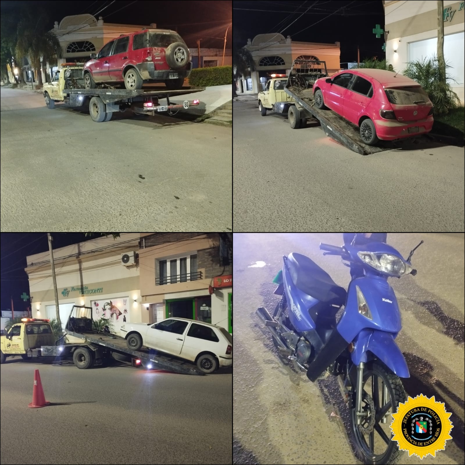 En la intersección de las calles Donovan y Echagüe de la ciudad de Federal, se llevó a cabo anoche un operativo conjunto entre la Policía y el área de Tránsito municipal. Durante el procedimiento, el Comando Radioeléctrico informó la retención de tres vehículos por falta de seguro obligatorio y una motocicleta debido a la ausencia de carnet de conducir y seguro vencido.