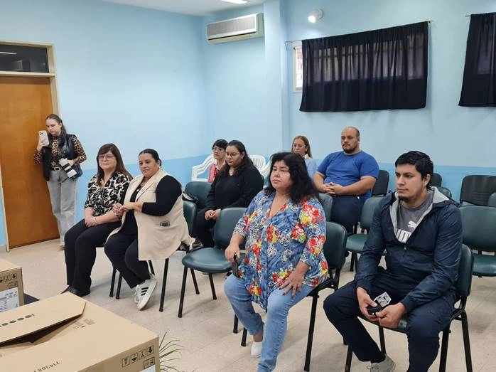 Susana de la Madrid, subsecretaria de Desarrollo Social, recibió equipamiento para la sala “7 de Septiembre”, acompañada por representantes de centros de salud de Cimarrón y Bernardi, legisladores provinciales y autoridades locales.