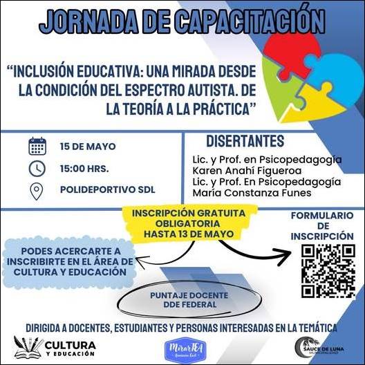 Desde el Municipio de Sauce de Luna invitan a participar de la jornada de formación y reflexión sobre la inclusión educativa de personas con Condición del Espectro Autista (CEA). GISELA LAGOS, DE LA ASOCIACIÓN CIVIL MirarTEA, SE REFIRIÓ AL EVENTO EN UNA NOTA REALIZADA POR RADIOINTEGRACIÓN 90.5 – LEA / ESCUCHELA.