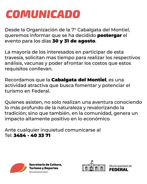La organización del evento anunció que se reprogramó para el 30 y 31 de agosto, dando más tiempo a los participantes para cumplir con los requisitos sanitarios y económicos. La cabalgata busca promover el turismo y el desarrollo local en Federal.