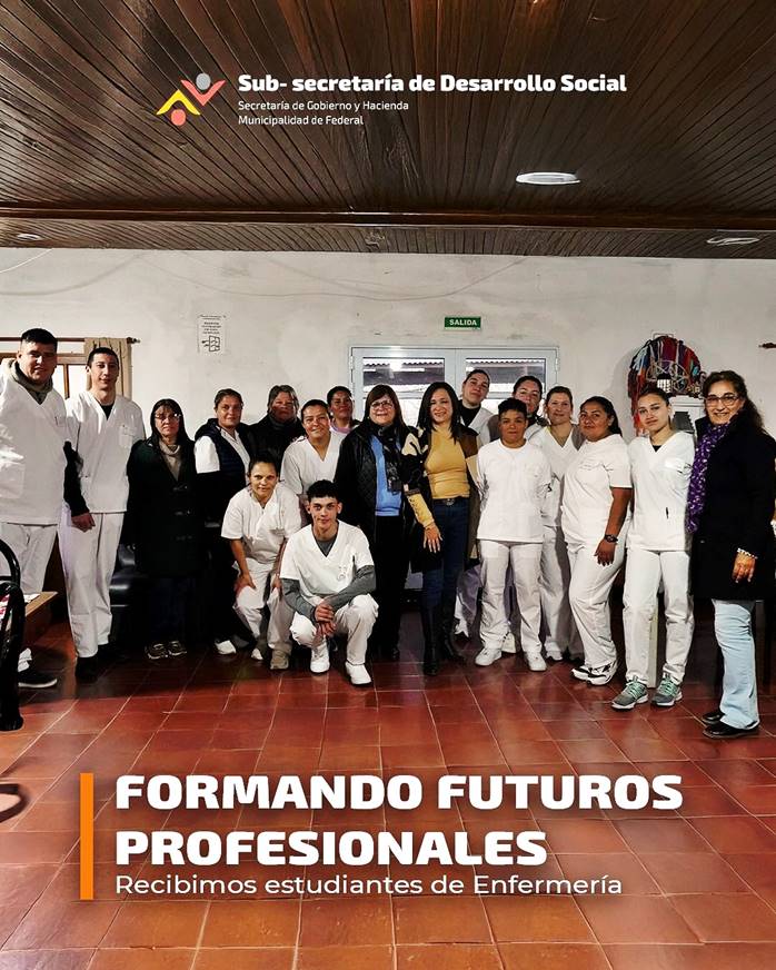 En el marco del convenio entre la Municipalidad de Federal y el Instituto Dr. Luis Arienti, el municipio recibió a estudiantes de Enfermería que realizan sus prácticas en la Residencia de Adultos Mayores, el Centro de Salud de B° Salto y la Sala 7 de Septiembre de B° Campo de Mayo.