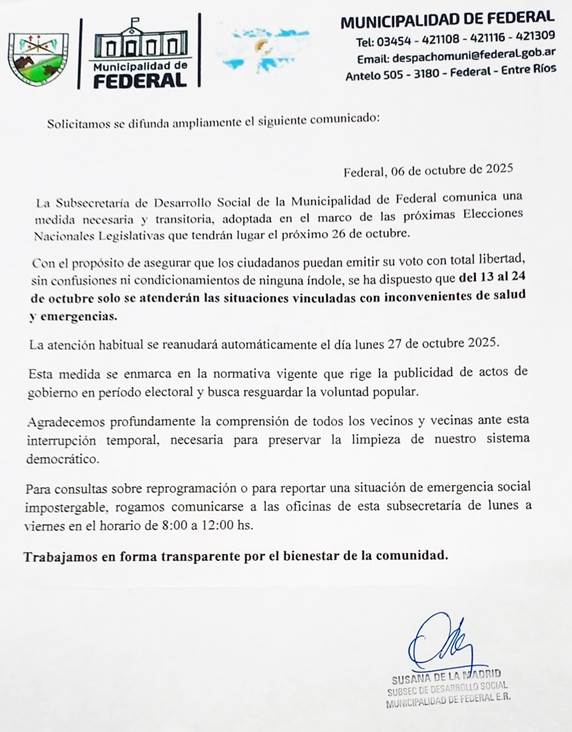 La Subsecretaría de Desarrollo Social de la Municipalidad de Federal comunica una medida necesaria y transitoria, adoptada en el marco de las próximas Elecciones Nacionales Legislativas que tendrán lugar el próximo 26 de octubre.