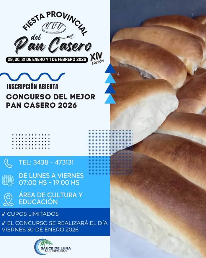 Los organizadores de la Fiesta invitan a inscribirte para participar del “Concurso del Mejor Pan Casero 2026”, en el marco de la XIV Edición de la Fiesta Provincial del Pan Casero, que se realizará en Sauce de Luna.
