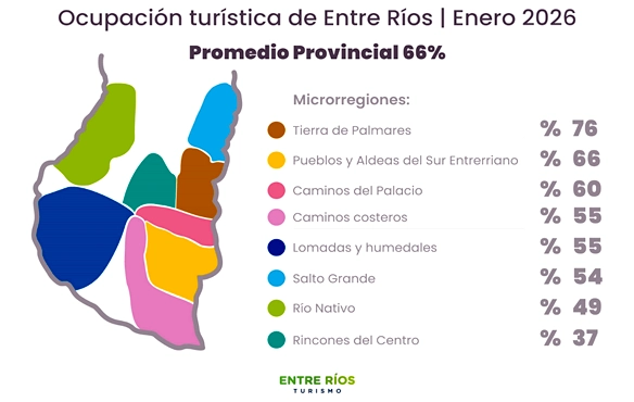 La Secretaría General de la Gobernación, a cargo de Mauricio Colello, presentó a través del Ente Mixto de Turismo de Entre Ríos (Emturer) los resultados estadísticos correspondientes a enero de 2026, elaborados a partir de la información brindada por los municipios y organizados por microrregiones. Durante el período, la provincia alcanzó un promedio de ocupación del 66 por ciento en plazas hoteleras y parahoteleras (hospedajes, bungalows, cabañas, casas y departamentos) y recibió un total de 2.085.383 visitantes.
