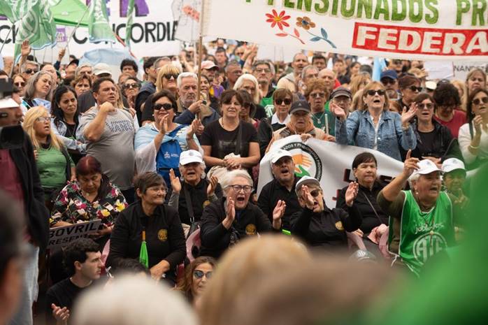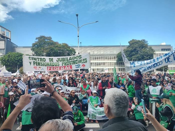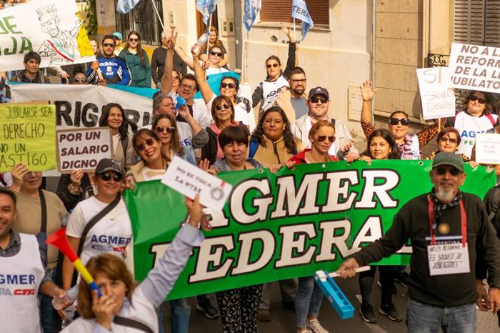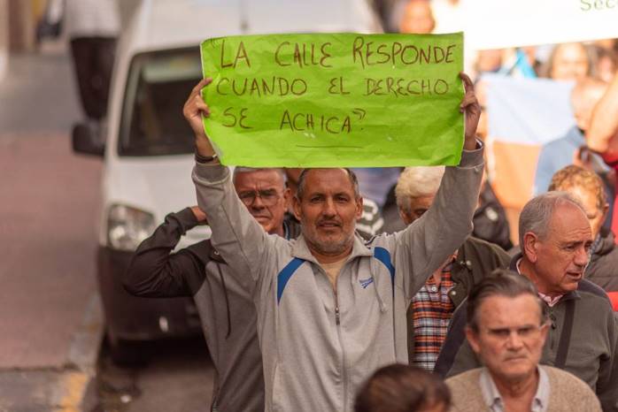 Lucrecia Brasseur, del centro de jubilados de Paraná, tomó la palabra ante las cámaras en vivo de Canal Once. “Nos preguntamos si vamos a tener derecho a terminar nuestros días un poco más tranquilos y felices. Parece que jubilarse no está en relación a esos sentimientos. No estamos en contra de nadie. Defendemos un sistema jubilatorio, trabajado, solidario y generacional”, expresó la jubilada docente cuando arrancaba el paso de la columna, a pocos metros de la sede de la Caja de Jubilaciones, sobre calle Corrientes.
