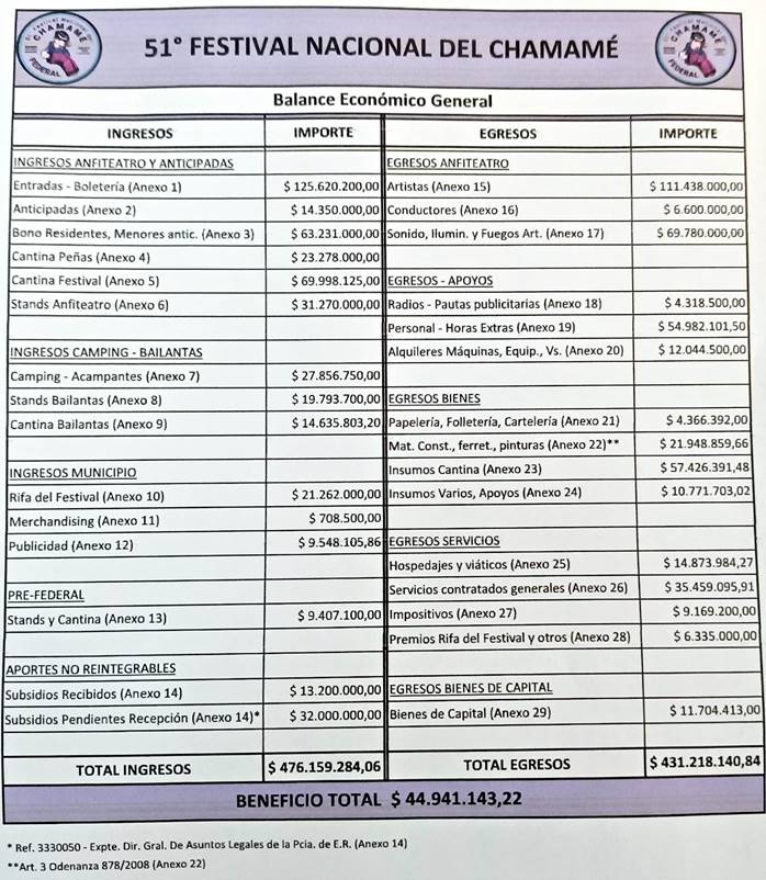 “Hemos dado siempre los balances con total transparencia, que es lo que nos caracteriza, porque trabajamos para eso, porque trabajamos con honestidad y transparencia desde el primer Festival tuvimos ganancia, y debo decir que en el festival 50 y en el festival 51 todos los gastos para materiales horas extras todo lo que se necesita para el festival del chamamé lo paga la comisión central del Festival del Chamamé”, expresó Alicia Oviedo.